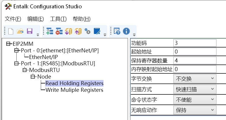 17、同样在NODE处单击鼠标右键插入功能码,并填写读取的寄存器参数;