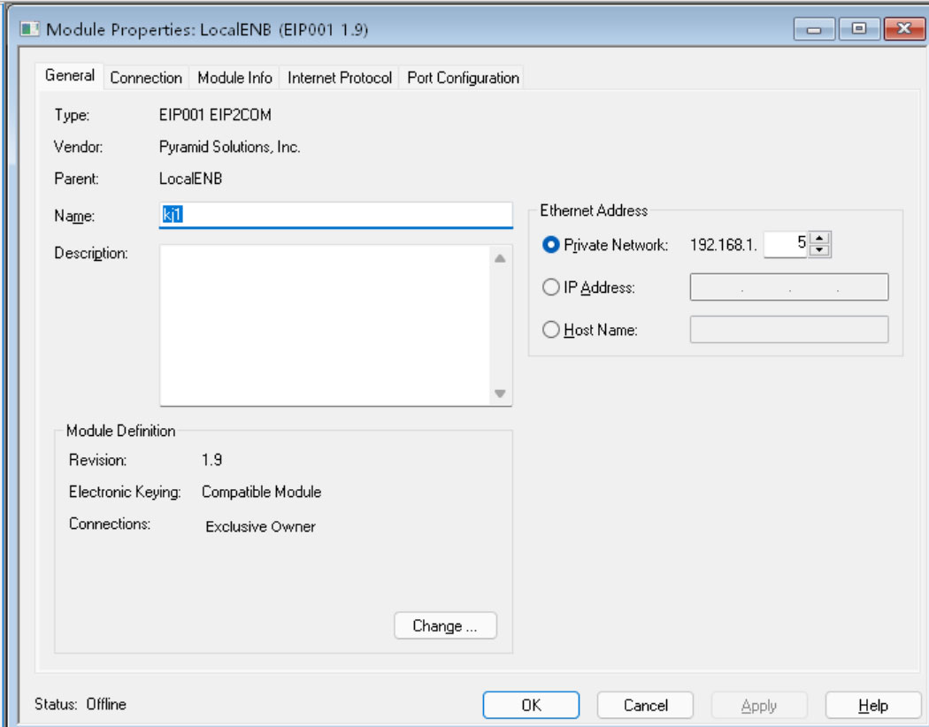 9、设置Modbus转EtherNet/IP网关的设备名称(名称可随意)和IP地址,本例为KJ1 IP192.168.1.5;