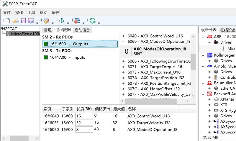 8、 在从站的过程数据中选择好对应的PDO以及所需参数,本例选择的是控制字,速度及模式状态字四项参数;