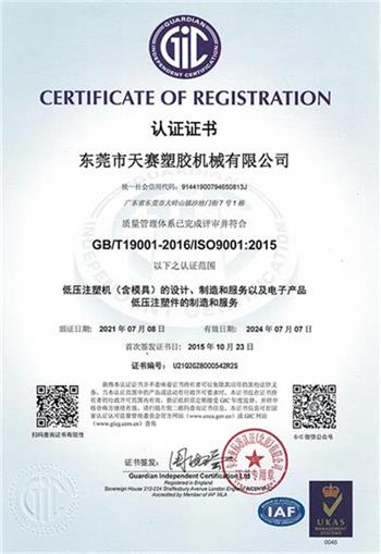 证书介绍 东莞市天赛塑胶机械有限公司ISO9001认证证书 证书图片 |