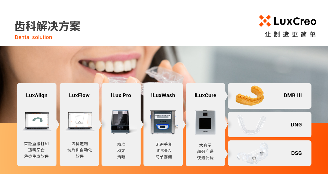 例如,国内3D打印智造商LuxCreo清锋科技就推出了数字化齿科3D打印解决方案。通过数据流将口腔设计、生产、治疗等流程串联,以此实现数字化、定制化、规模化生产齿科产品。以精尖的3D打印技术、急速光固化3D打印机设备及高精度齿科树脂材料,快速实现高效数字化牙科生产,制作的牙模、手术导板等,将助力技工所、临床门诊和正畸医师为牙科患者提供高品质的服务体验。