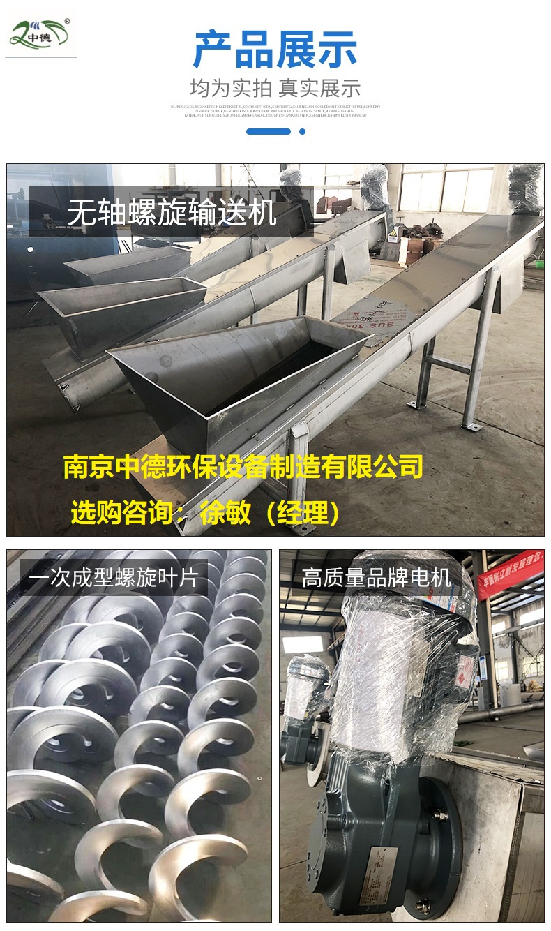 无轴螺旋输送机输对于输送带状、易缠绕物料有特殊的优越性。无轴螺旋输送机用途: WLS型系列无轴螺旋输送机用于污水处理厂输送中细格栅其栅条净距50mm的除污机栅渣和压滤机泥饼等物料。 环保性能好。采用全封闭输送和易清洗的螺旋表面,可保证环境卫生和所送物料不受污染、不泄漏。 扭距大、能耗低。由于螺旋无轴,物料不易堵塞,排料口不堵塞,因而可以较低速度运转,平稳传动,降低能耗。扭距可达4000N/m。输送量大。输送量是相同直径传统有轴螺旋输送机的1.5倍。输送距离长。单机输送长度可达60米。并可根据用户需要,采用多级串联式安装,超长距离输送物料。能机动工作,一机多用。既可下方出料,又可端头出料。采用特制衬板,该机可在高温下工作。结构紧凑,节省空间,外型美观,操作简便,经济耐用。