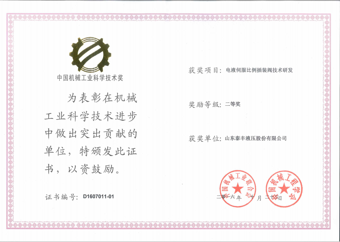 新闻中心 山东泰丰液压股份有限公司“电液伺服比例插装阀技术研发”项目获2016年度中国机械工业科学技术二等奖