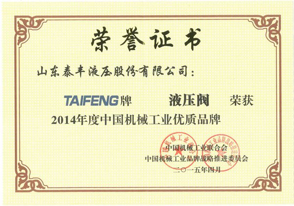 为进一步贯彻落实党中央国务院一系列关于质量品牌建设的精神和习大大总书记关于“三个转变”的重要指示,2015年全国机械工业品牌战略推进工作会议于4月28日在北京隆重召开。会议对在品牌建设活动中涌现出的65家企业的72种品牌的优质产品进行了表彰。我公司的“泰丰”牌液压阀荣获机械工业优质品牌。