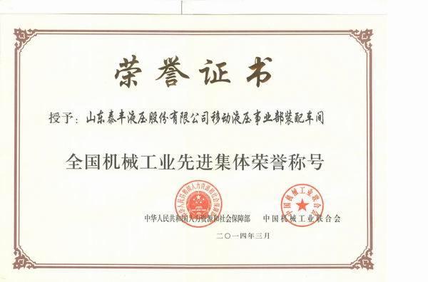 3月26日上午,中华人民共和国人力资源和社会保障部与中国机械工业联合会在北京京西宾馆大礼堂隆重表彰全国机械工业先进集体劳动模范和先进工作者,党和国家领导人出席了颁奖会。全国机械工业先进集体劳动模范和先进工作者每五年评选一次。此次共有100个单位被评选为全国机械工业先进集体。我公司移动液压事业部装配车间,经过市、省、全国层层选拔,脱颖而出,荣膺“全国机械先进集体”称号。