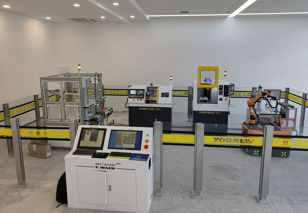 走进苏州某学院实习实训室,智能制造实训基地“弘扬工匠精神助力中国智造“几个大字映入眼帘,虽然这间实训基地不大,但却集中安置了最先进的育菁装备的小型智能产线,在这条精致的产线上,包括数控加工中心、数控机床、协作机器人、AGV小车、RFID系统、激光打标机、立体仓库、视觉检测系统,配套产线总控系统软件(MES)、伺服性能优化软件、加工工艺优化软件等教学设施、软件一应俱全,产线分为智能产线加工区