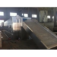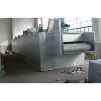 物料由加料器均匀地铺在网带上,网带一般采用12-60目不锈钢丝网,由传动装置拖动在干燥机内移动。干燥机由若干单元组成,单一单元热风单独循环,部分尾气由排湿风机排出,废气由调节阀控制,热气由下往上或由上往下穿过铺满物料的网带完成热量与质量传递的进程,带走物料水份。网带缓慢移动,运行速度可根据物料温度自由调节,干燥后的成品连续落入收料器中。上下循环单元根据用户需要可灵活配备,单元数量亦可根据需要选取。