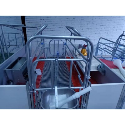 母猪产床,主体采用热浸锌管或喷漆管焊接,使其结构 合理,经济实惠,质量和寿命大幅提高,成为各大规模化养猪厂的 ,仔猪塑料地板,母猪球墨铸铁地板,扁钢大梁支撑。含母猪食槽,仔猪圆形补料槽,保温箱,电热板。