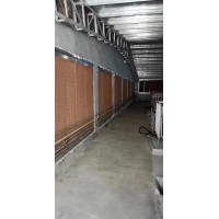 降温水帘是当下工厂降温的主流方式之一,由特种纸质蜂窝结构材料制作的水帘利用波纹状的纤维表面捕捉水流形成水膜,具有大接触面积的水帘在与外界流入热空气充分接触后完成湿热交换,然后蒸发带走大量的热量,从而使经过湿帘的空气温度降低,达到降温的目的。优点是投资成本低,运行成本小,无任何污染,不阻碍空气正常流通。