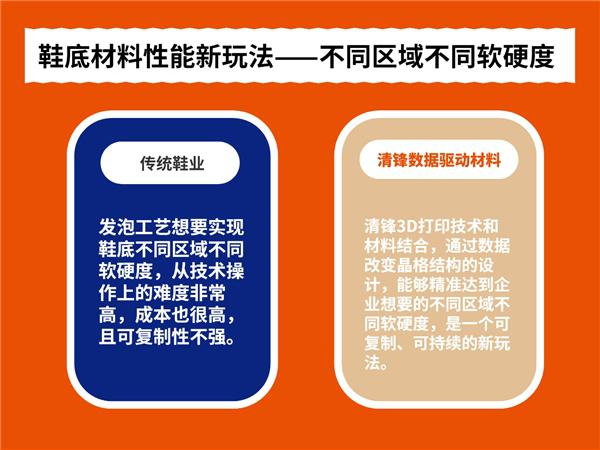 通过 3D 打印结合晶格结构实现不同区域不同软硬度 , 这种新技术路线对鞋行业未来发展具有深层次的贡献价值 , 也是众多鞋企想要尝试 3D 打印的原因。然而 , 传统鞋品牌想要做 3D 打印鞋却面临巨大的压力 , 其中重要的原因就来自 " 晶格的设计 "。受制于过去软件、设计工具等易用性不强、学习起来非常困难 , 想要学好更是难上加难 , 导致晶格设计很难实现 , 教育市场的成本也很高。而清锋包含软件、材料、硬件的整套解决方案可以帮助合作伙伴快速解决这个问题。